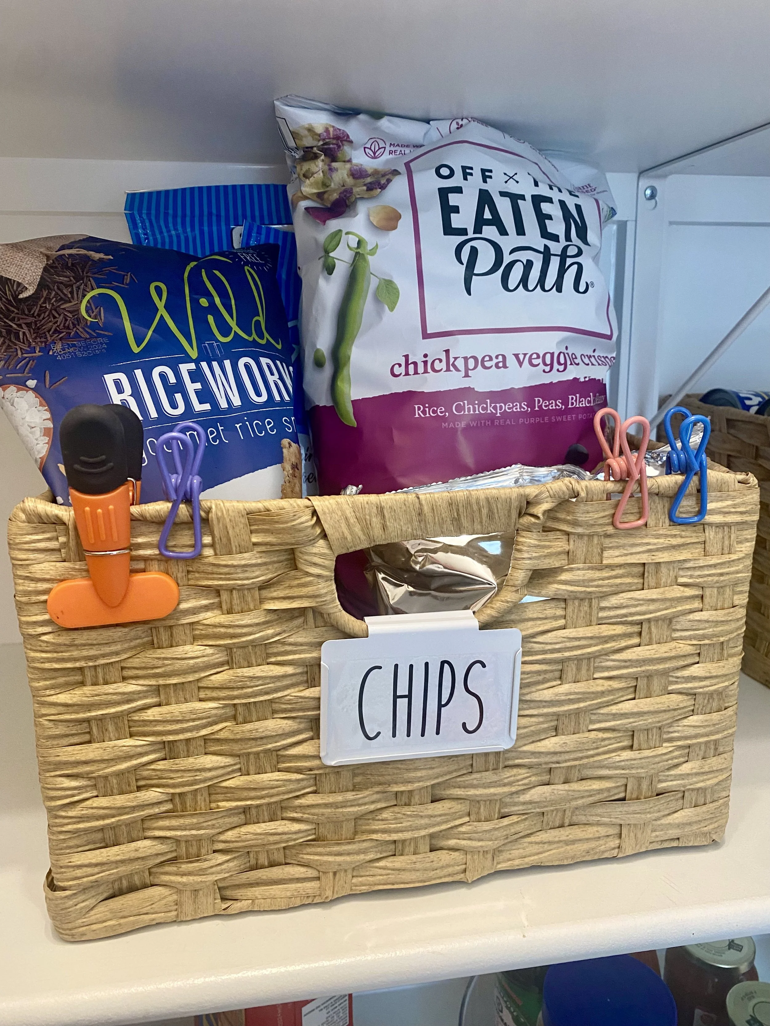Wicker basket labeled "Chips" containing bags of rice and chickpea snacks on a shelf.